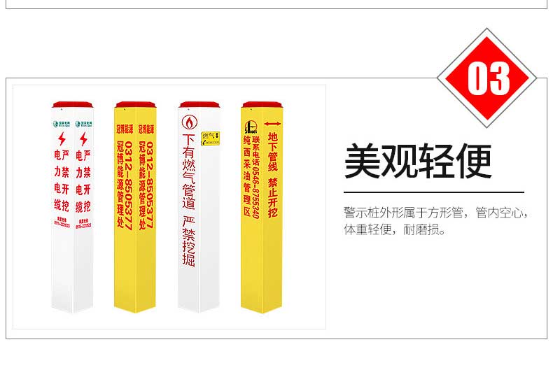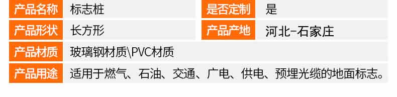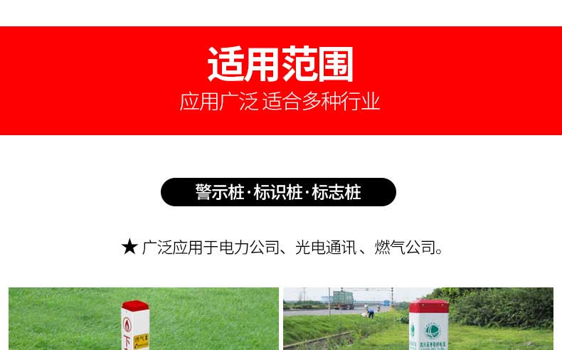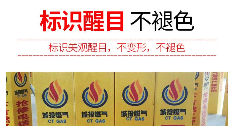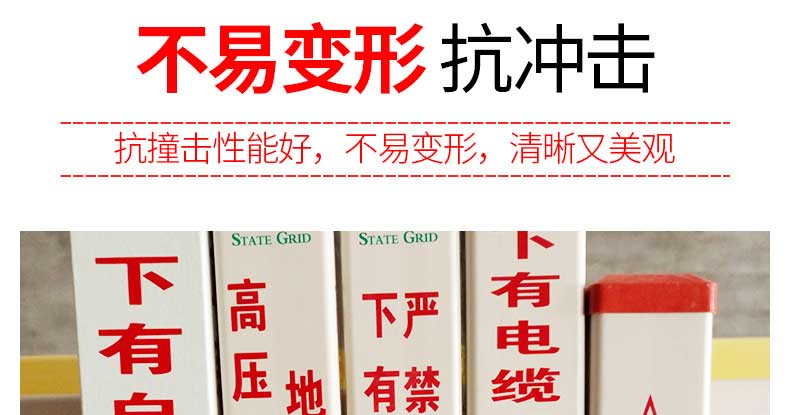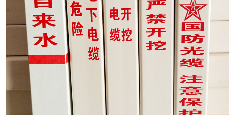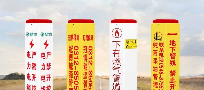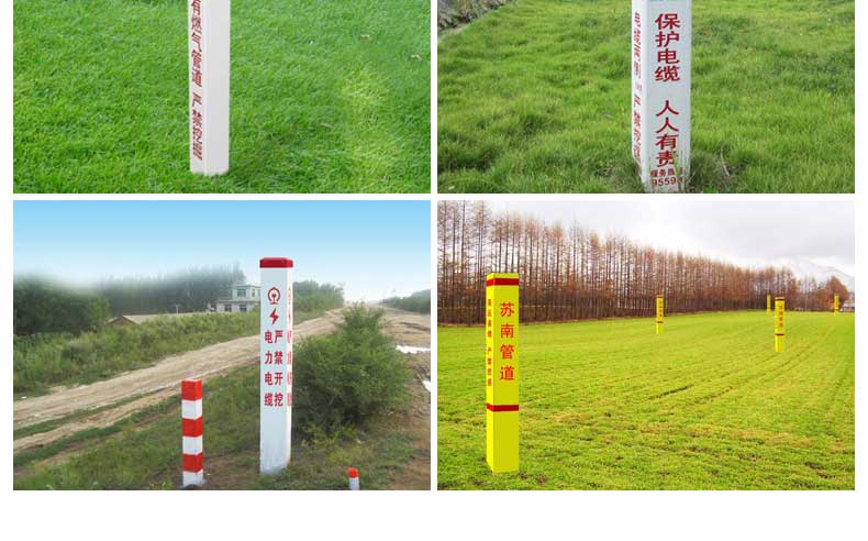 標(biāo)志樁又稱(chēng)為警示樁、標(biāo)識(shí)樁、標(biāo)志樁,常用于電力、通信、燃?xì)狻⒆詠?lái)水、鐵路地埋管線路徑指示標(biāo)志。用于戶(hù)外、綠化帶、灌木叢、頂管兩側(cè)管線路徑指示,起到警示作用的新型產(chǎn)品。