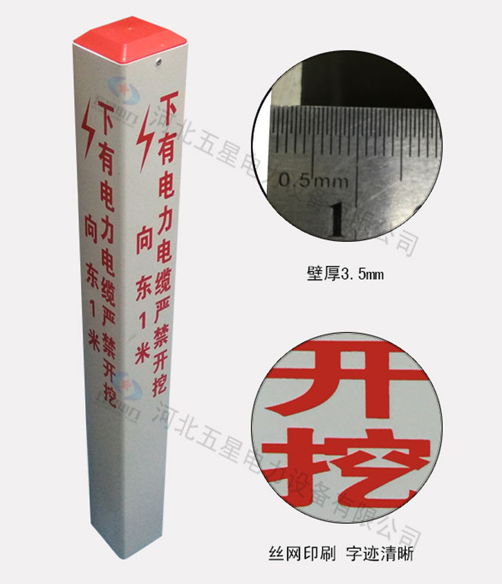 塑鋼標志樁采用塑鋼材質(zhì)制成,也稱為pvc標志樁,樁體為白色,常規(guī)規(guī)格為100mm*100mm、150mm*150mm。塑鋼標志樁材質(zhì)輕便、彈性好、耐酸堿、耐腐蝕、抗老化性能好、安裝運輸方便,是警示地下管線的標識產(chǎn)品,能夠清楚的標明管線的鋪設(shè)方向,便于大家區(qū)分不同的管線走向。