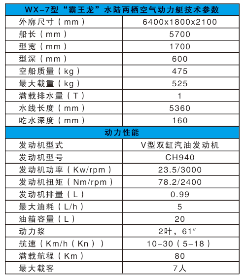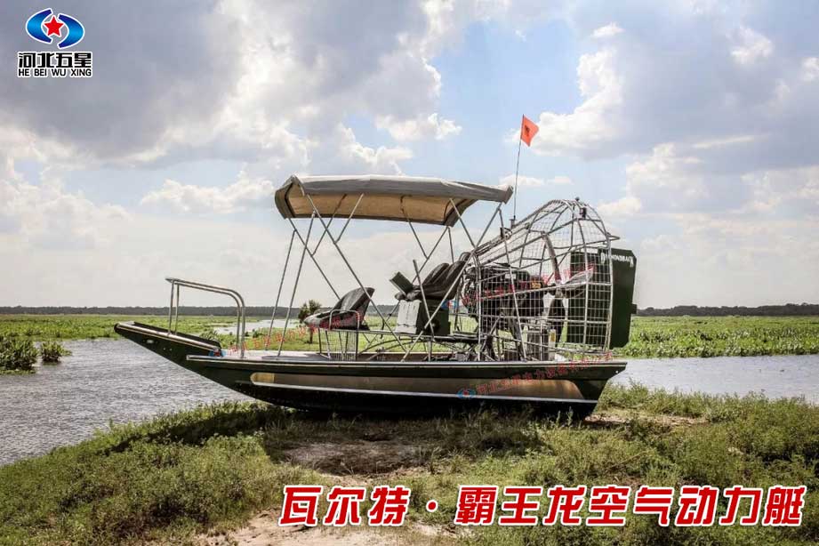 河北五星“霸王龍”水陸兩棲空氣動力艇是一種運用空氣動力學、采用航空發(fā)動機和空氣螺旋槳推動,通過置于船體上部的大功率內(nèi)燃機帶動碳纖維螺旋槳產(chǎn)生空氣動力的多地形交通工具。所搭載的航空發(fā)動機動力系統(tǒng)強勁,功率可達300馬力以上,螺旋槳推力可達500公斤以上,操縱機動靈活,靜水巡航速度可達40km/h,可以高時速可達70km--120km/h。